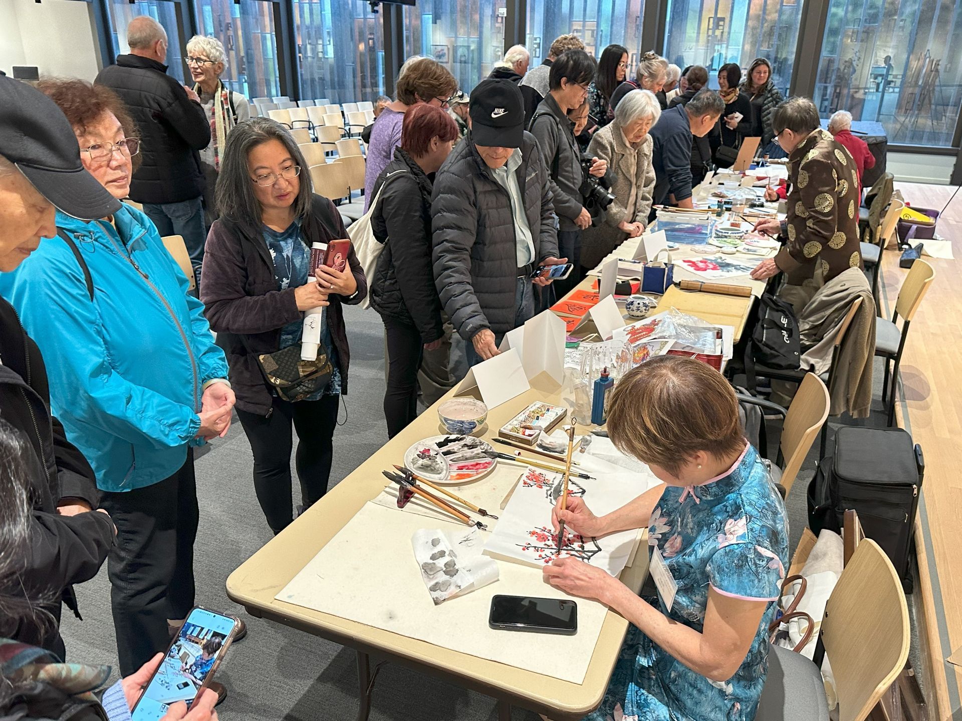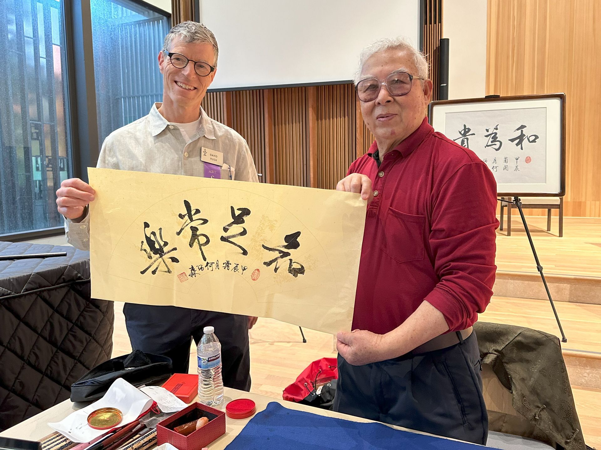Last Sunday’s grand opening of the Chinese Painting and Calligraphy Exhibit in the UUC chapel was a smash hit! Master Artist Hongduan Yang and his students welcomed visitors with warm smiles and good humor as they demonstrated traditional Chinese calligraphy and painting. Visitors from both the UUC family and the artists’ circles crowded about, asking questions and generally delighting in the exchange of creativity and culture.