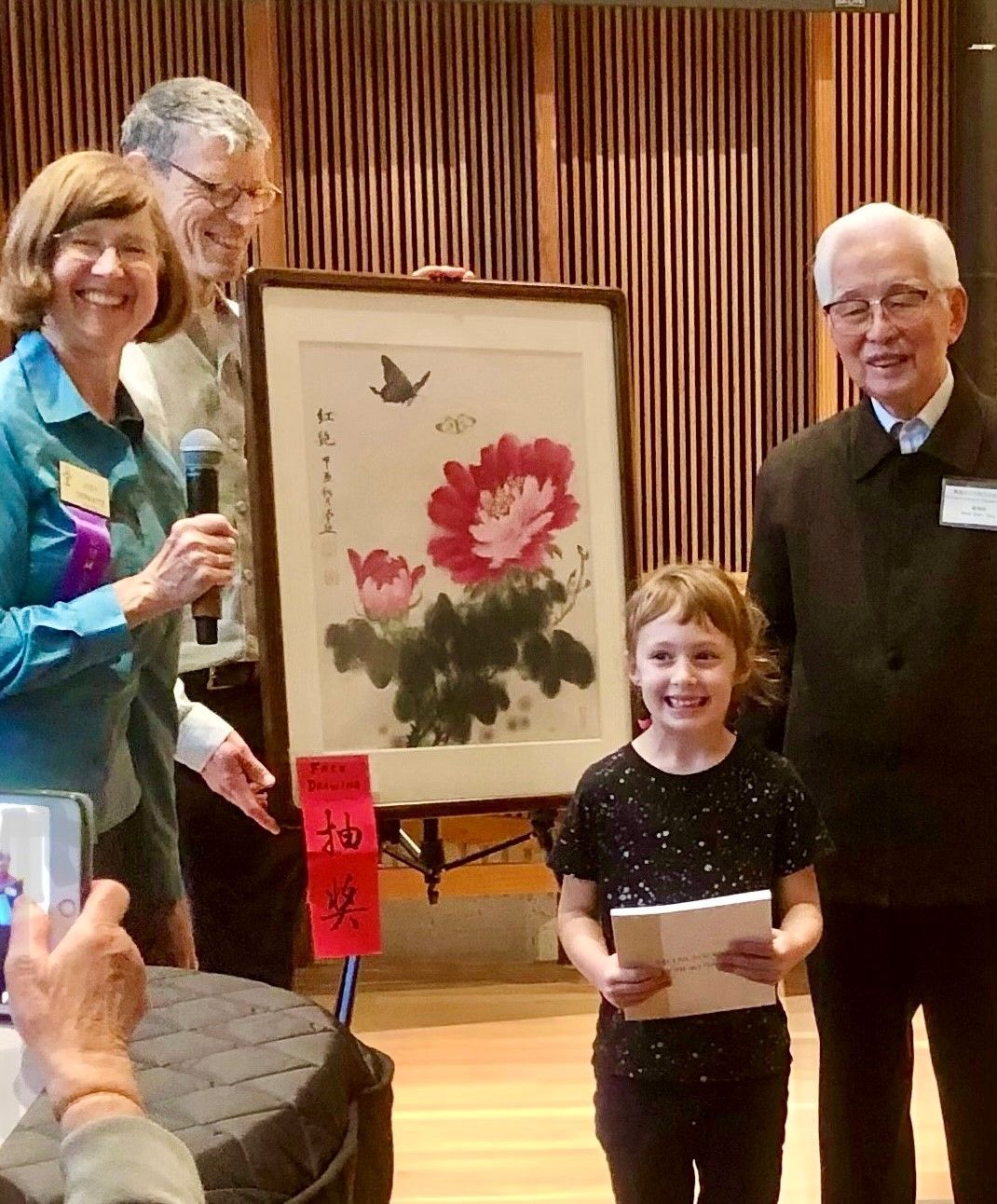 Visitors young and old were thrilled to watch their name painted in both English and Chinese on bookmarks. Several artists demonstrated full paintings, and these practice works were later given away to those in attendance. Young UUC member Sophie Bianamara won a beautiful painting of red flowers and butterflies. In addition, copies of Selected Works of Chinese Painting by Master Yang and his students were raffled to lucky winners. The artists also served homemade Chinese treats, including bean paste–filled mochi designed as charming orange pumpkins.