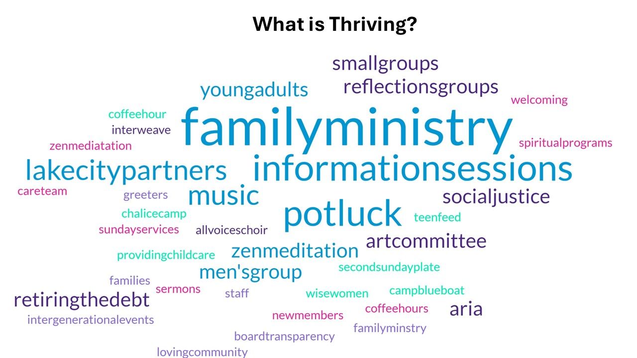 Most group members thought their own groups were thriving. Several groups gave the potlucks as an example of positive well-attended, multigenerational experiences. Groups thought family ministry and our support to homeless service entities were thriving areas. The fact that the church paid off its building debt was also noted repeatedly as a sign that UUC is thriving. Folks appreciated the music and thought the information sessions offered after each service were working well to connect people to groups.