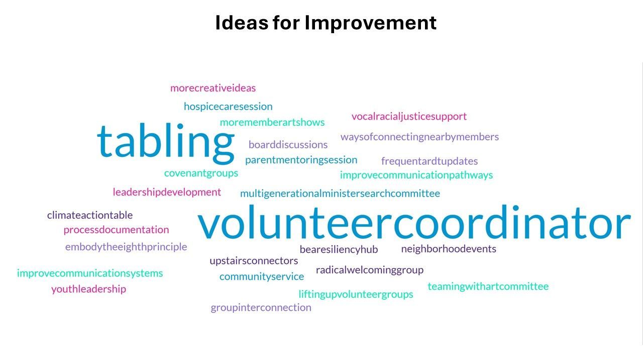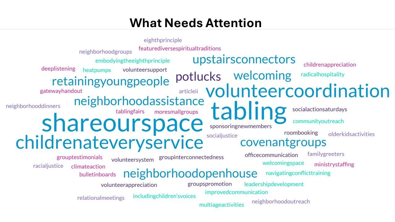 The most frequent suggestions for how group members thought we could address areas needing attention were to feature rotating group tables and holding one or more tabling fairs, and to recruit a volunteer coordinator. Other ideas included serving as intentional upstairs connectors at coffee hour, active support for racial justice and the 8th Principle, supporting more potluck type events, using our space to host outside organizations, more small group discussions, inviting our neighbors to events, more intergenerational events, and recruiting church office support volunteers.