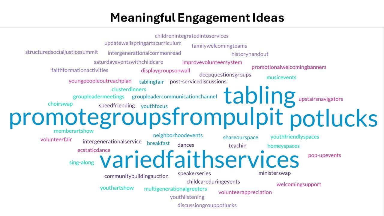 Several specific ideas included minister and choir swaps, group tabling fairs, speed friending, music and dances, breakfasts and small group discussions. Participants wanted more group leader connection opportunities, intergenerational service elements, increased family involvement, involvement of youth in volunteer roles and considering a youth advisory council.