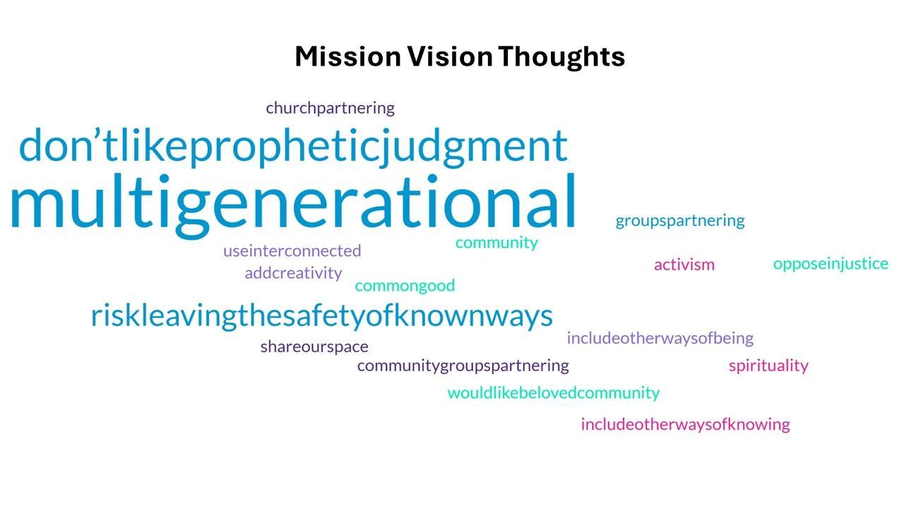 When asked for thoughts about what resonated in the vision statement. The most favorable comments were about the vision of a multigenerational community. Several liked the vision that we will “risk leaving the safety of known ways.” A number felt uncomfortable with the “stand in prophetic judgment” wording.