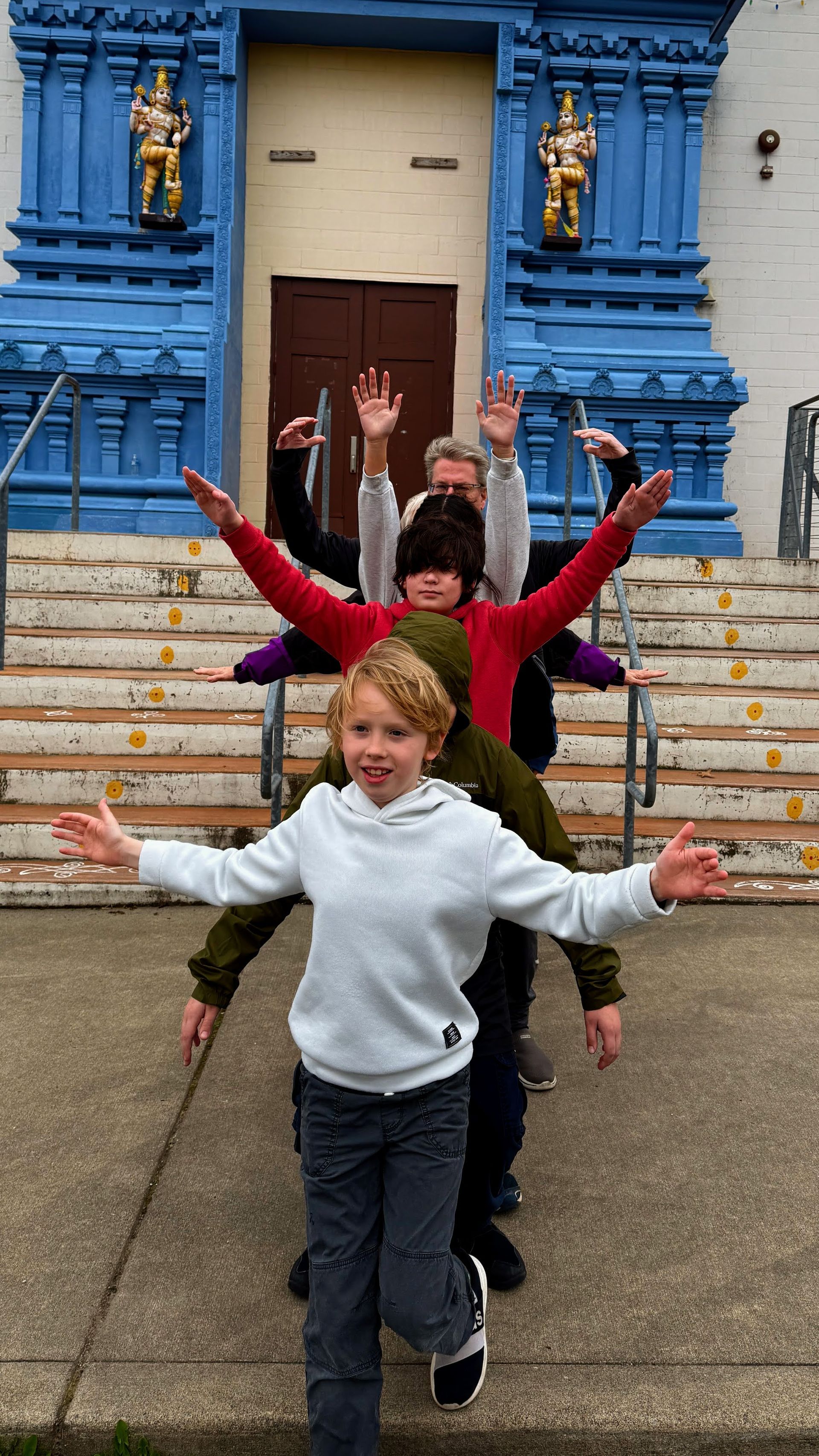 Photo: World Religions field trip participants pose like the Hindu goddess Durga, the protective mother of the universe. Durga’s fierce love is just one expression of the Supreme God.