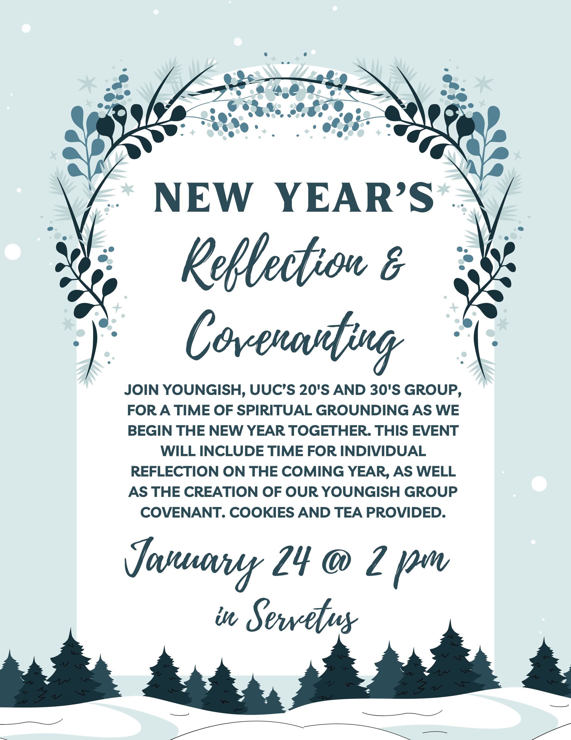 Join Youngish, UUC’s 20's and 30's group, for a time of spiritual grounding as we begin the new year together. This event will include time for individual reflection on the coming year, as well as the creation of our Youngish group covenant. Cookies and tea provided.