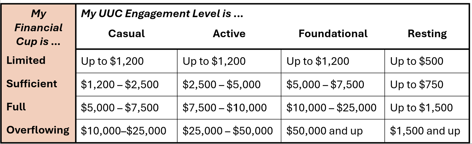 The table below can help you reflect on your household’s financial situation and engagement with UUC. This table reflects giving patterns at UUC in recent years.